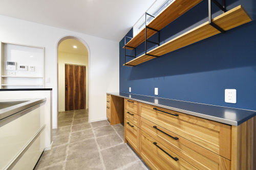 玄関を開けると、かわいいタイルニッチがお出迎えし、その横には土間収納+趣味の部屋があります。釣り好きな旦那様にはうれしい空間です。リビングは、ウォールナットの床と天井梁の空間が広がり、時間が経つにつれ、風合いと質感を変えてくれる無垢材ならではの「あじ」を楽しめます!!
