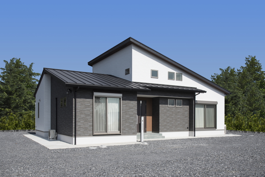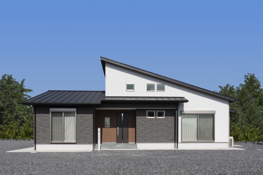 茨城県桜川市にスキップフロアーのある平屋住宅が完成しました。 外壁はメンテナンス性に優れたコーキングレスのサイディングを使用し、勾配天井で開放感を高めた造りが特徴のおしゃれなデザイナーズハウスです。設計上、家事動線を深く配慮した間取りも特徴的で、ランドリースペースを室内に配置すると同時に、そのまま外へも出られる構造にもなっています。
